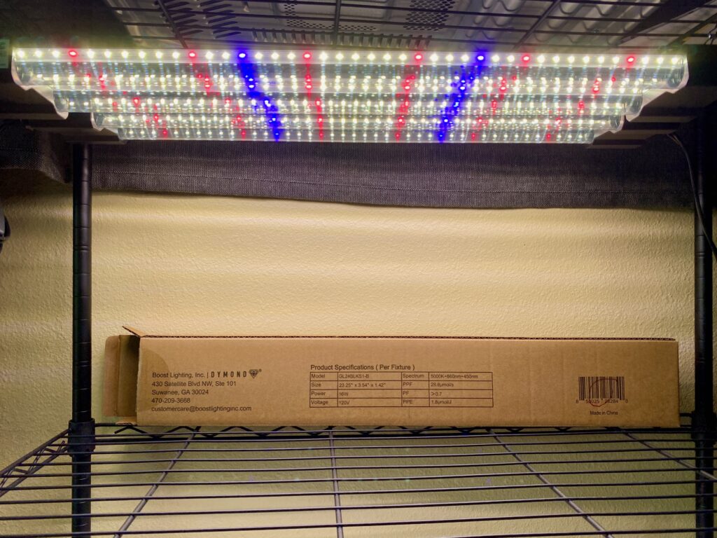 I chose a LED grow light that not only was full spectrum but had specific red and blue wavelengths. I got the DYMOND BoostGro LED Seed Starter Grow Light from Amazon and not only do the two connect into each other, but they were easy to install on my metal shelf we purchased for seedlings and growing some inside as needed. So far I’ve been pretty happy with the light especially that I can use one switch to turn them on and off together.